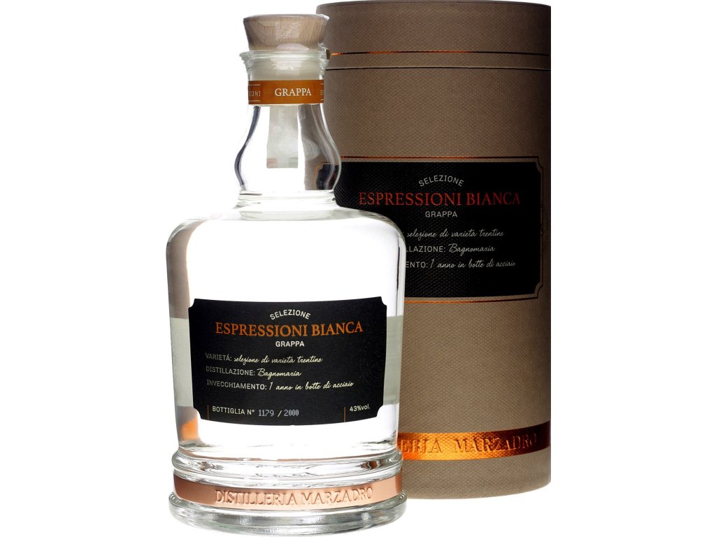 Bianca je čistá, v sudech nevyzrálá varianta grappy z řady Espressioni. Zrála jeden rok v nerozových tancích. Nabízí průzračnou, svěží chuť, která je přímočařejší a bez vlivu dřeva, díky čemuž působí živě a autenticky. Je to grappa pro ty, kteří hledají její nejčistší podobu. Espressioni Bianca je mimořádně elegantní, plná prémiová grappa, se vyrábí z nejkvalitnějších trentinoských výlisků. Její kulaté, jemně vyvážené aroma nastavuje standardy a zajišťuje působivou komplexnost chuti. Jedná se o limitovanou edici, které bylo vyrobeno pouze 2 000 lahví poblíž jezera Garda. Marzadro plní tuto čirou, ultra prémiovou grappu.